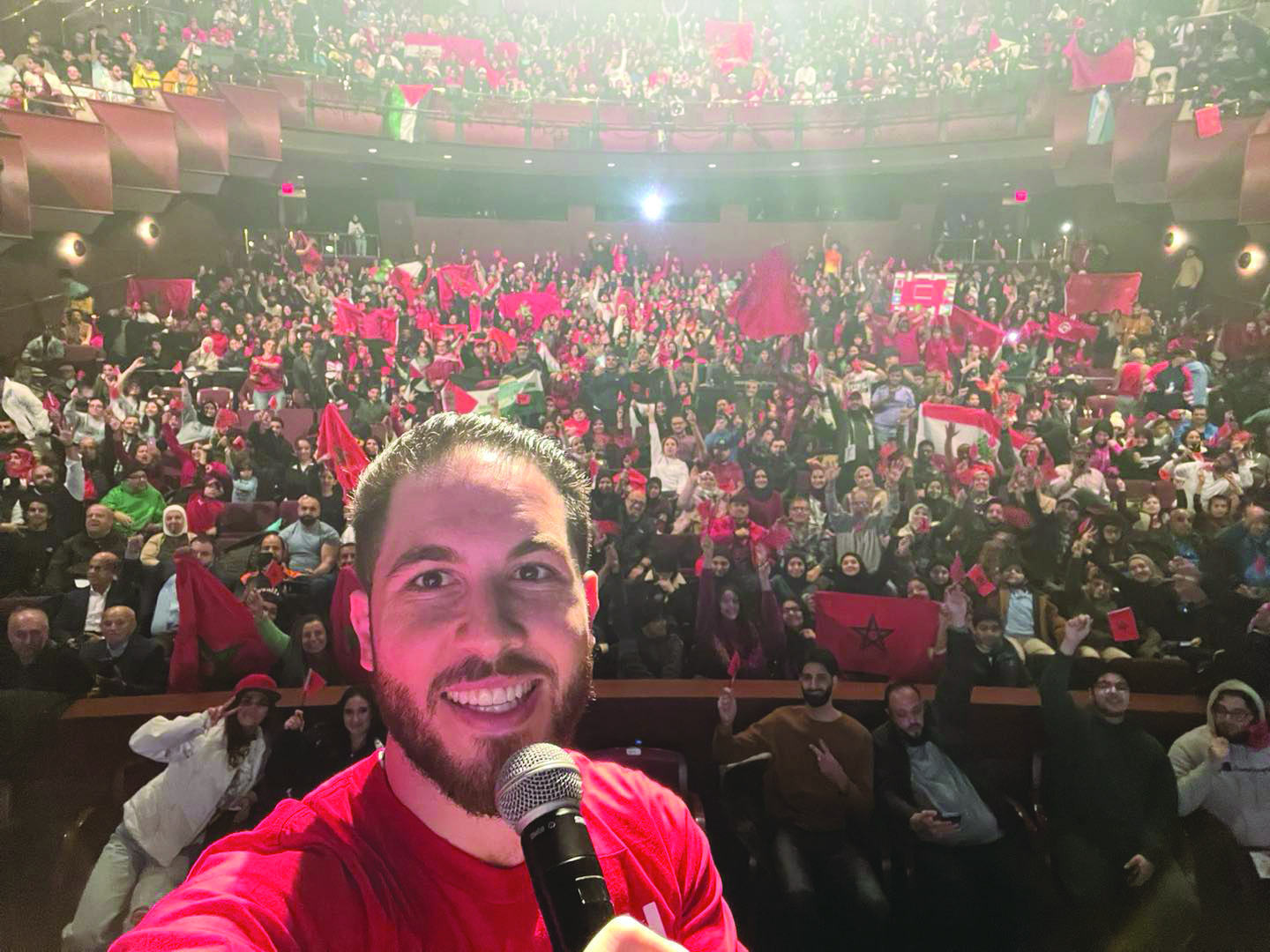 - رئيس بلدية ديربورن عبدالله حمود في صورة سيلفي مع المشجعين الذين ملأوا مسرح «مايكل غايدو» لمشاهدة مباراة المغرب مع فرنسا