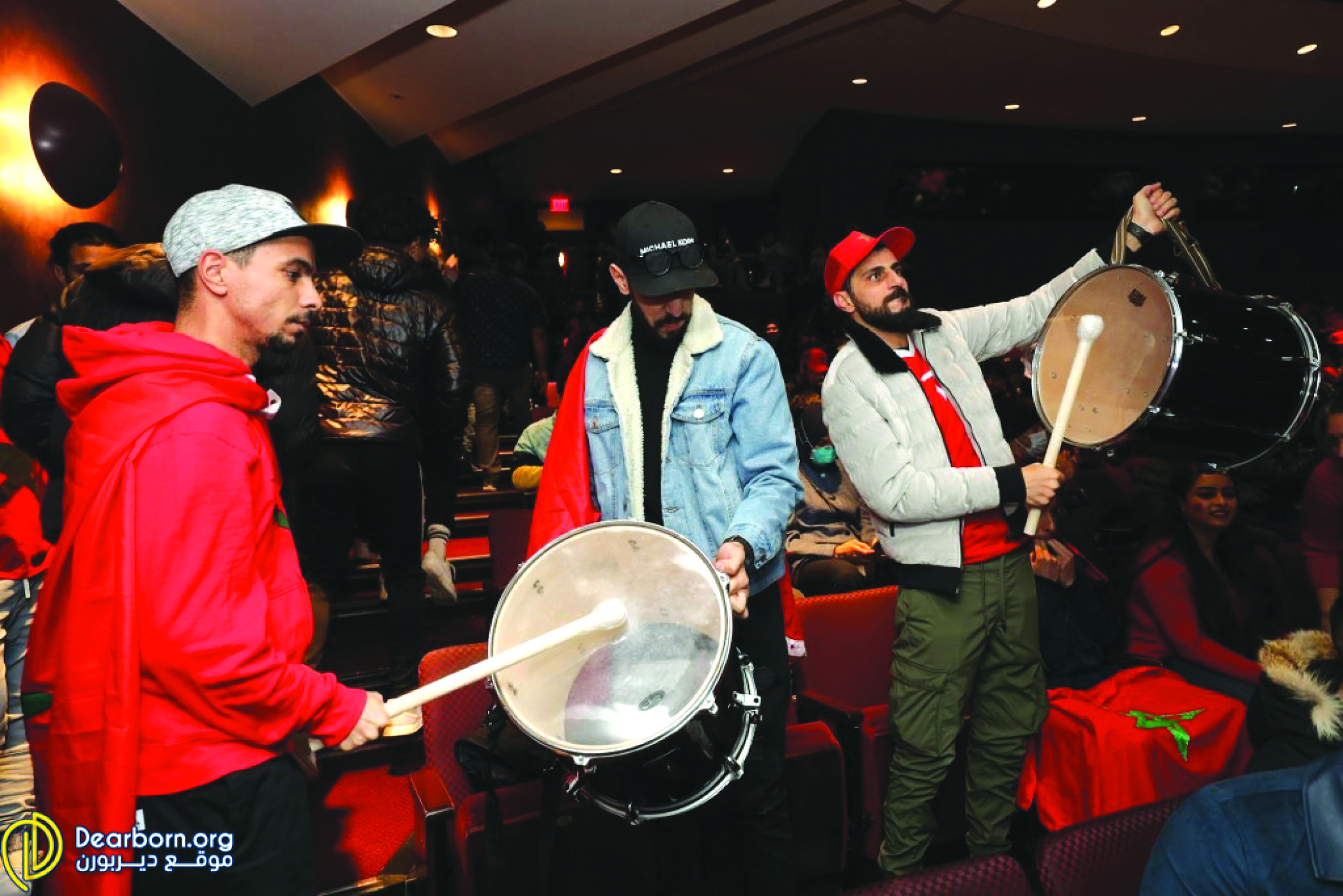 وكان مسرح «مايكل غايدو» في «مركز فورد للفنون»، الذي يتسع لـ1,200 شخص، قد ضاق بأمواج المشجعين الذين ملأوا القاعة قبل ساعة من بدء المباراة، ما دفع المنظمين إلى فتح قاعة «لينكولن» المجاورة لاستيعاب الأعداد المتزايدة التي تدفقت من جميع مناطق الانتشار العربي في منطقة الديربورنين، للاحتفال بأول منتخب عربي يتأهل إلى دور نصف النهائي في تاريخ كأس العالم.